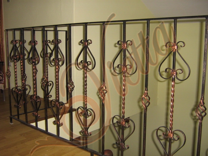 Sectiunea superioara realizata din otel lat de dimensiuni 30 x 8 mm sau 20 x 8 mm, ce are rol si de mana curenta ,forjata la cald si elemente executate din otel patrat de diametru 12 mm.Stalpi de montaj sunt din teava rectangulara de dimensiuni 30x30x3 mm sau 40x40x3mm prevazuti cu placa de fixare .Se poate vopsi in diverse nuante de culori, in functie de dorinta clientului.