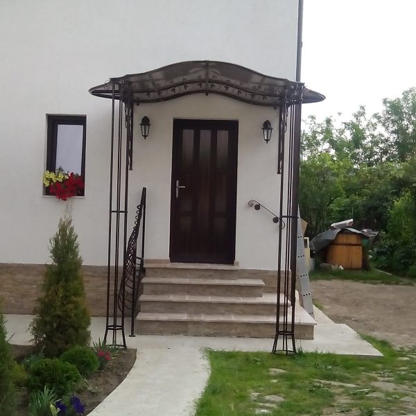 Structura metalica a copertinei este construita ca un singur bloc, sudata complet sau cu componente prinse cu suruburi pentru a rezista actiunilor vanturilor puternice. Spre deosebire de copertinele retractabile, copertinele construite de catre firma noastra sunt fixe si nu sunt afectate de furtuni sau rafale de vant. Toata partea metalica si elementele de fier forjat ale copertinei sunt curatate in prealabil si tratate anti-rugina prin vopsire cu grund anticoroziv. Fiecare copertina se construieste individual in functie de amplasament si se monteaza finisata, cu modelul de policarbonat dorit. Structura metalica se vopseste in culoarea dorita de client. La comanda se poate construi aproape orice forma de copertina cu orice elemente de fier forjat in functie de dorinta clientului.